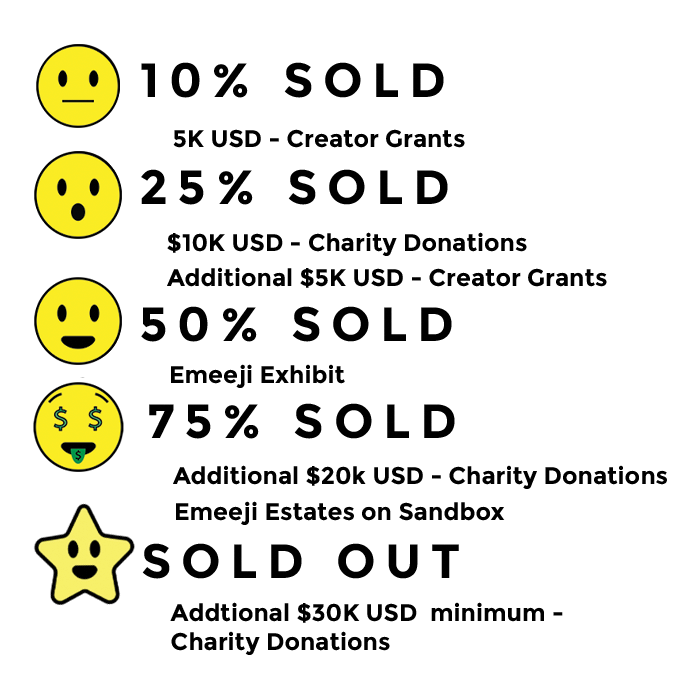 The bedrock of this project was to create opportunities to give to a variety of charities supported by both the Emeejis team and the community at large. With a successful sellout, a minimum of $60K USD will be directly donated to multiple groups and organizations! All remaining funds in the charity wallet will be used as part of a wider fundraising event - this aims to donate even more money and boost our charity wallet to work towards sustainability.